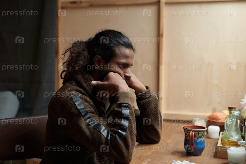 Мыслящий мужчина сидит в уютной деревянной кухне