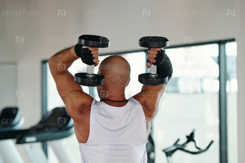 Мускульный мужчина поднимает гантели в фитнес-клубе
