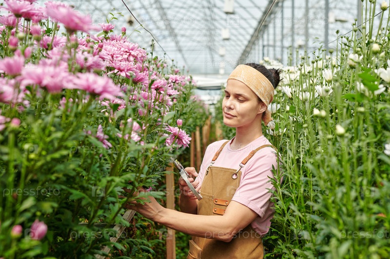 Женщина, работающая на цветочной плантации в теплице заботящаяся о растениях