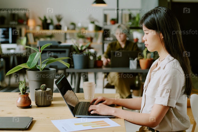Азиатская женщина, работающая в биофилическом офисе