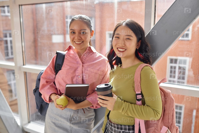 Счастливые студенты колледжа смотрят на камеру в коридоре