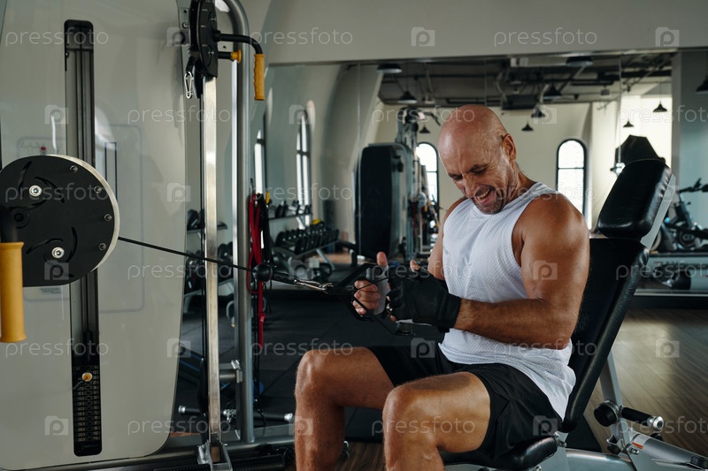 Мужчина накачивает свои мышцы на спортивном оборудовании