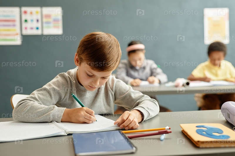 Молодой мальчик, пишущий в копийке на столе в классе в школе