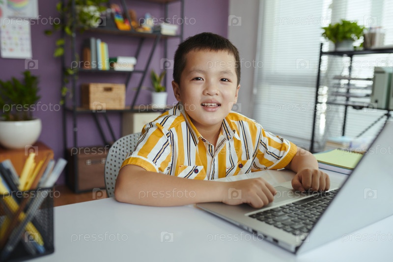 Портрет улыбающегося мальчика, сидящего с ноутбуком за рабочим столом