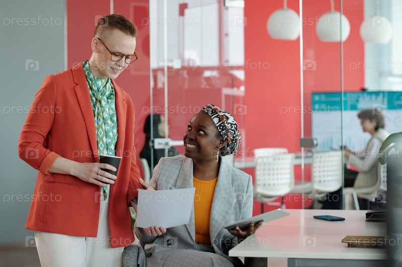 Коллеги обсуждают работу во время просмотра документов в офисе