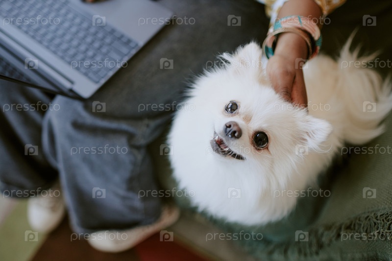 Человек ласкает пушистую белую собаку, работая на ноутбуке