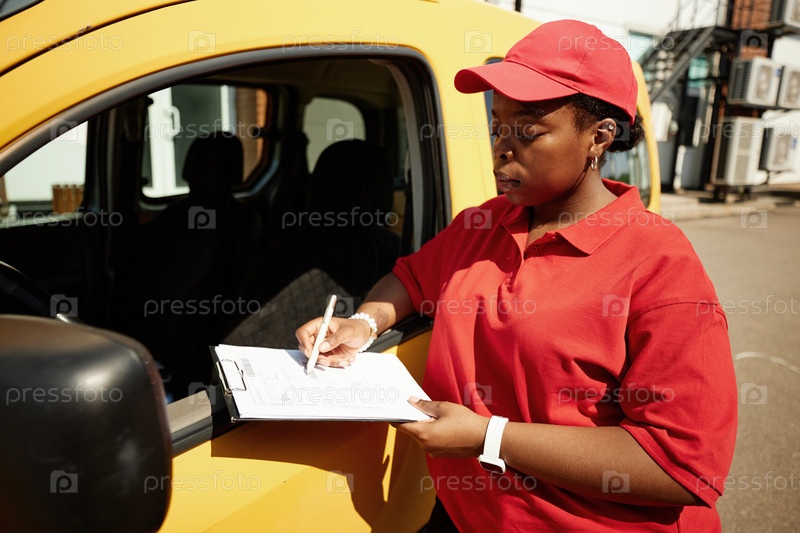 Работник доставки, носящий шапку, пишет на клипборд