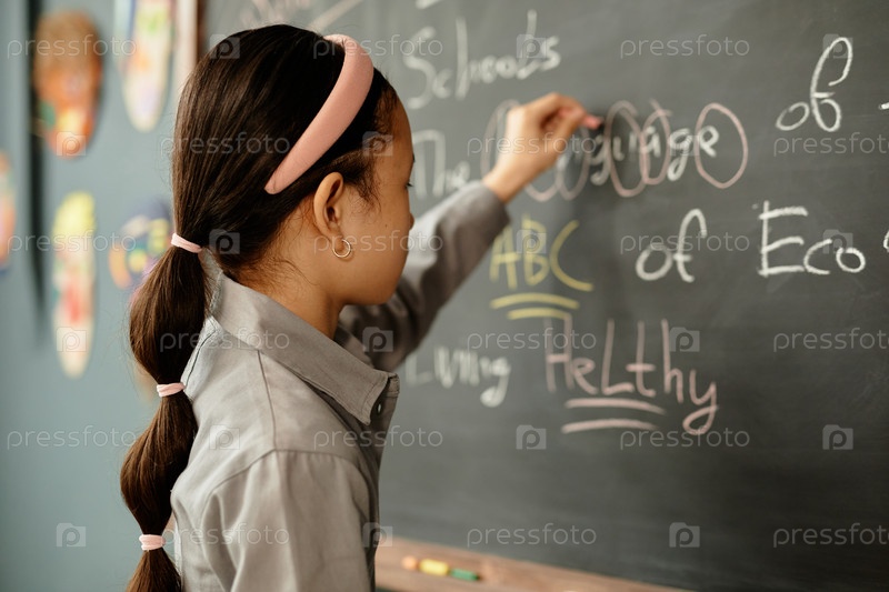 Девушка с волосами, стилизованными белыми галстуками, пишет на доске во время урока в школе