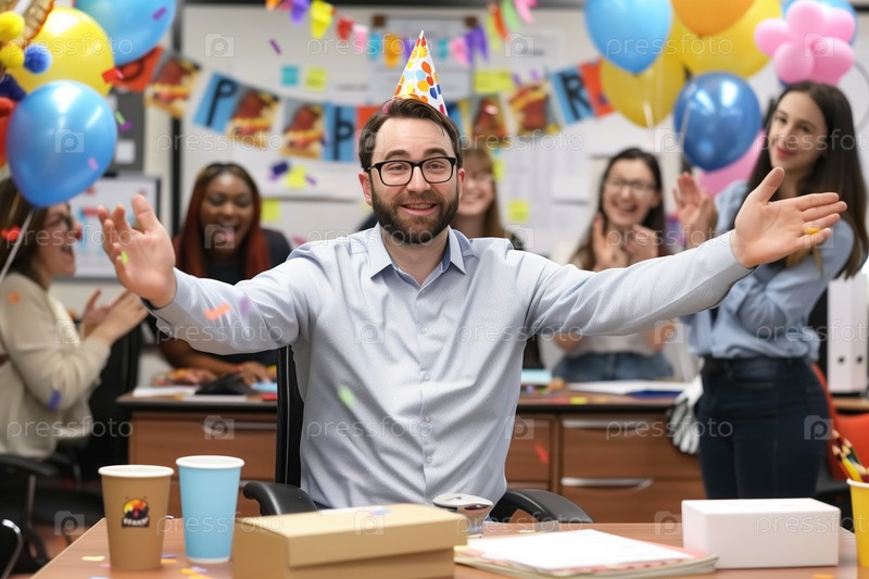 Празднование дня рождения в офисе с коллегами, которые радуются