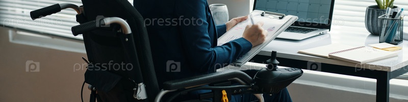Деловая женщина с инвалидностью, сидящая на рабочем месте