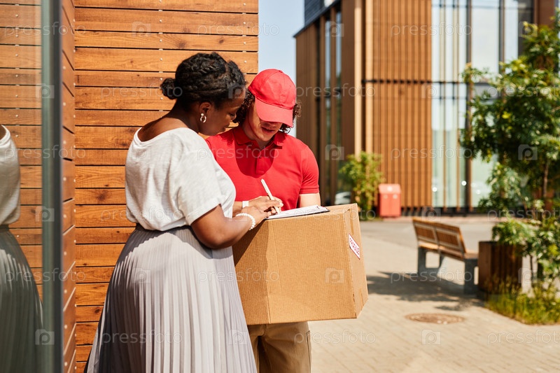 Получение пакета доставки от курьера в уличной обстановке