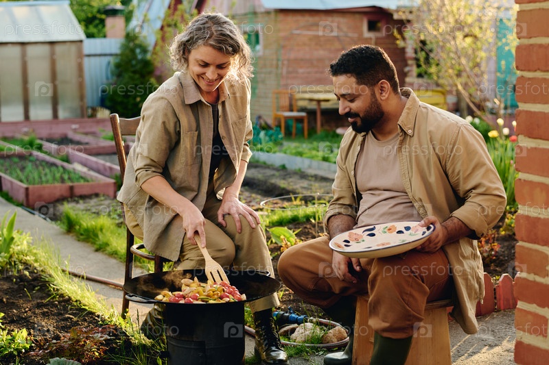 Два фермера, склонившиеся над жаркой сковородкой