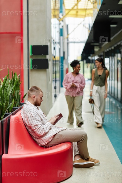Бизнесмен использует планшет для работы, сидя на диване в гостиной офисного здания
