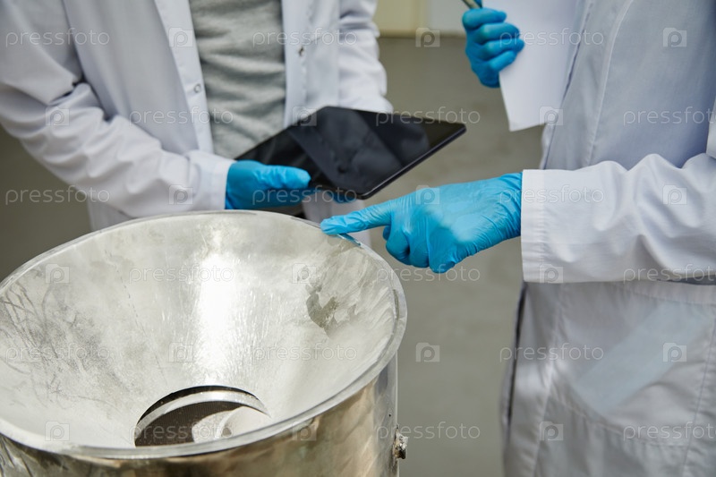 Два процессовых техника проверяют нержавеющую трубу для порошка на фармацевтическом заводе