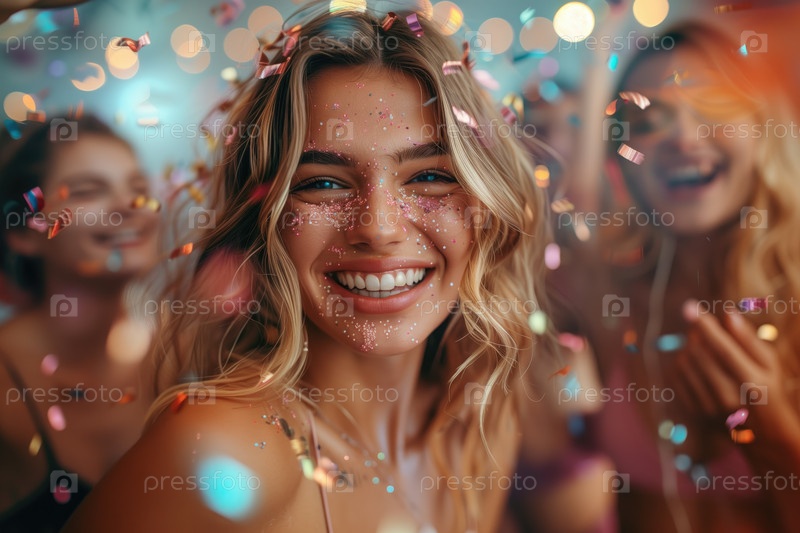 Улыбающаяся женщина празднует на торжественной вечеринке с друзьями