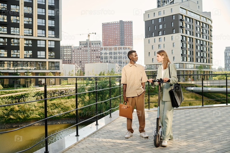 Молодые коллеги разговаривают на свежем воздухе