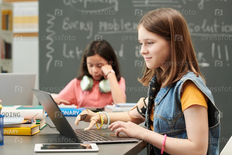 Девушка с протезированной рукой, использующая ноутбук