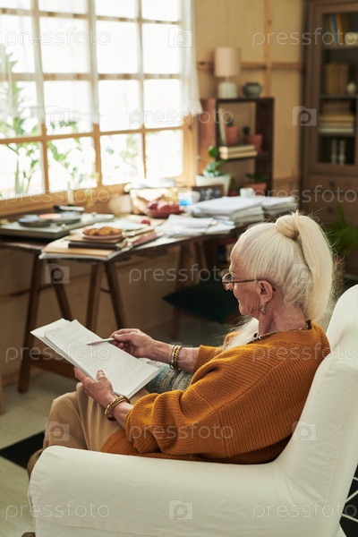 Старшая женщина, сидящая в помещении и читающая мирную книгу