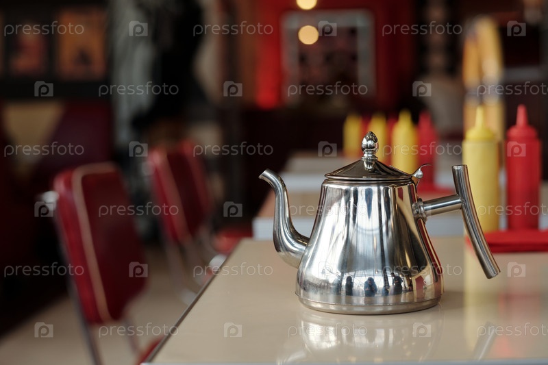 Блестящий металлический чайник помещен на кафе-стол, окруженный сиденьями