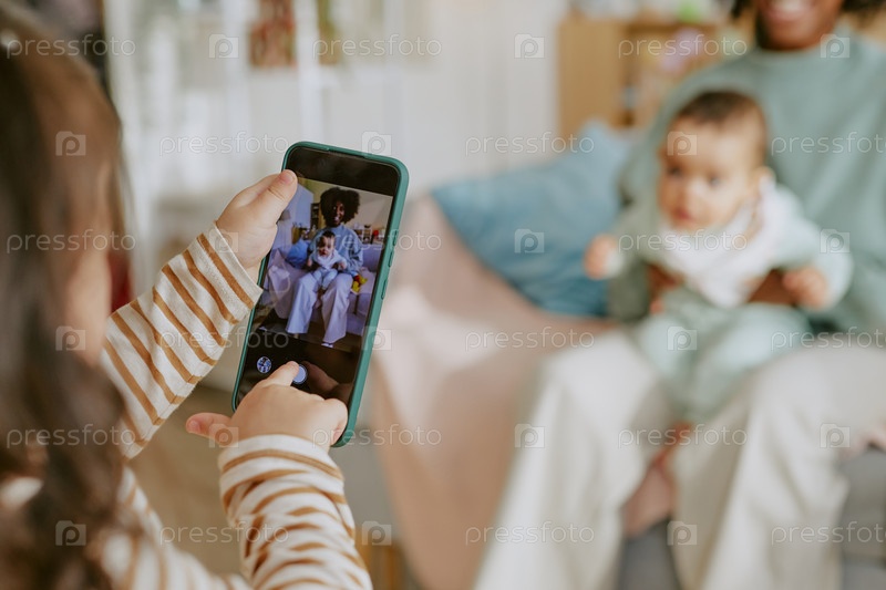 Маленькая девочка фотографирует мальчика и его мать
