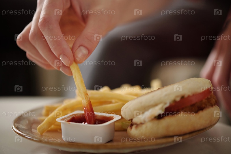 Ручное погружение картофеля в кетчуп