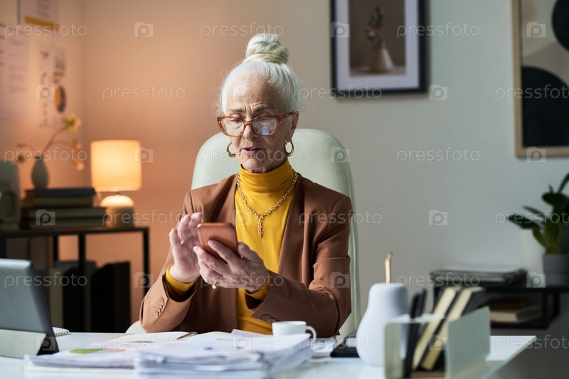Портрет старшей женщины, сидящей за рабочим столом и смотрящей на телефон