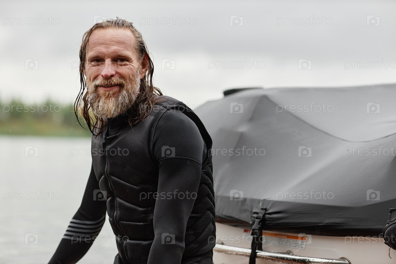 Улыбающийся бородатый мужчина в мочевом костюме на лодке после спортивных мероприятий