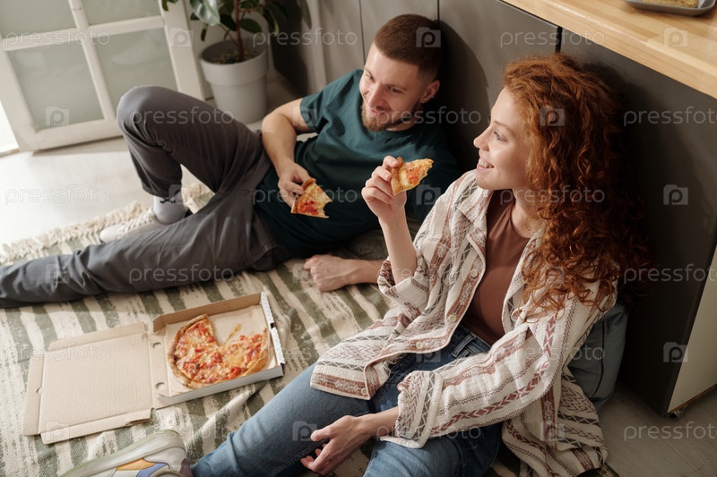 Молодая пара наслаждается обедом на полу
