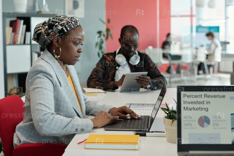 Афроамериканская женщина работает на ноутбуке в офисе