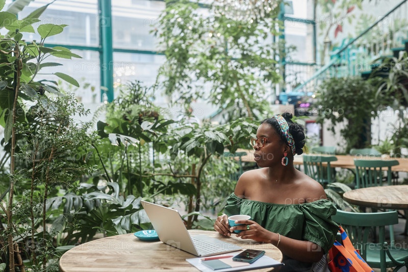 Женщина, отдыхающая в зеленом кафе