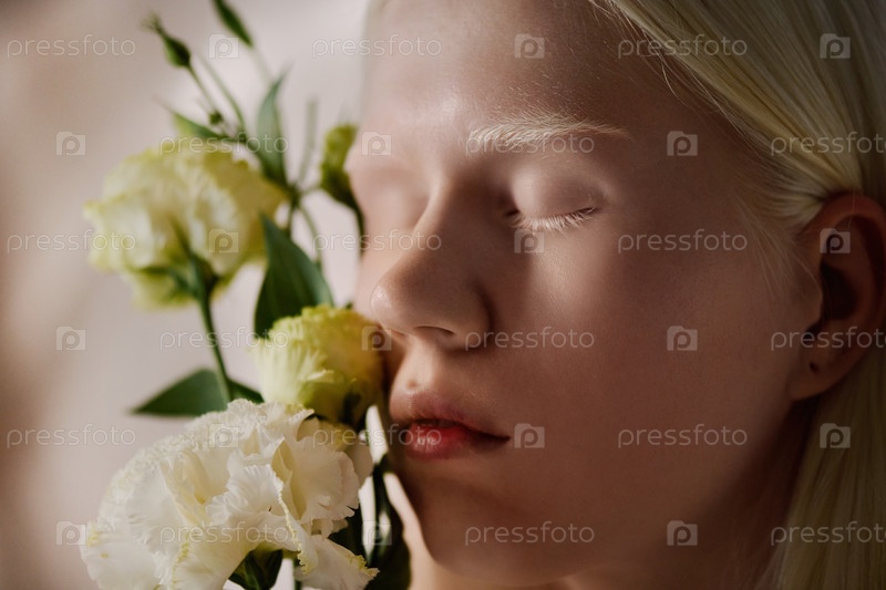 Девушка с альбинизмом с цветами Eustoma