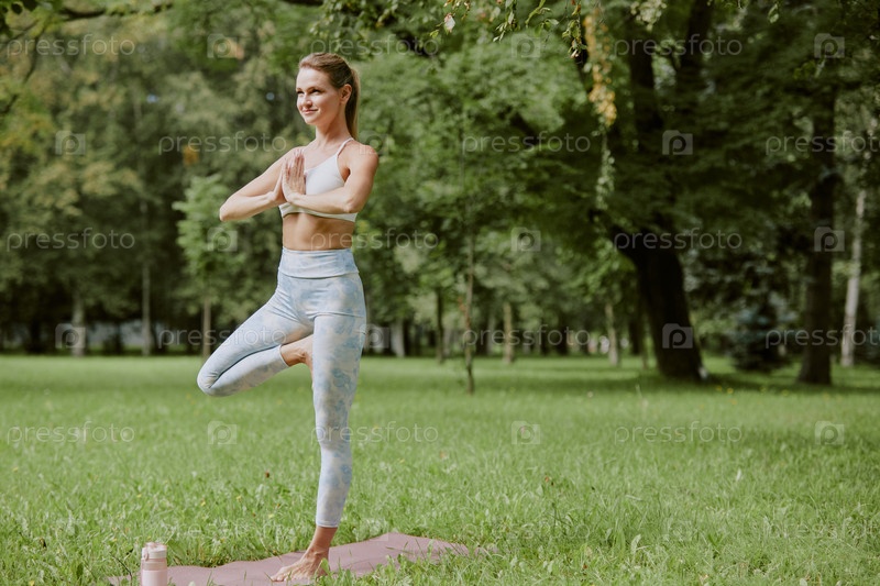 Взволнованная женщина практикует йогу под открытым небом