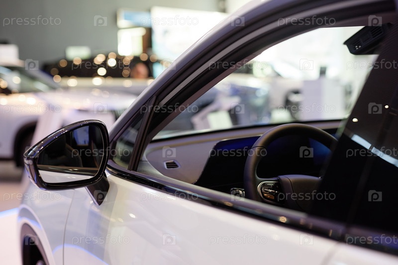 Заднее зеркало белого автомобиля с открытым окном в выставочном зале