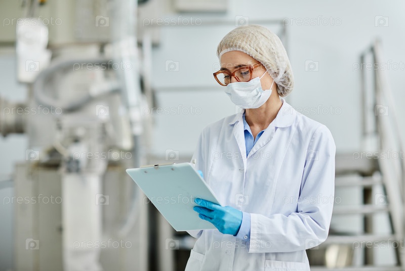 Женщина-наблюдатель по производству пишет в блокноте на фармацевтической фабрике