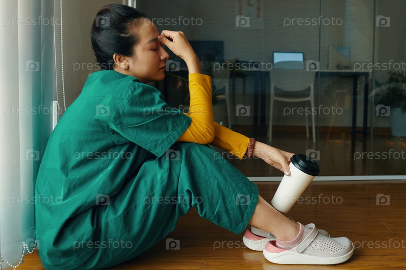Медитирующая женщина, сидящая у окна и держащая в руках Tumbler