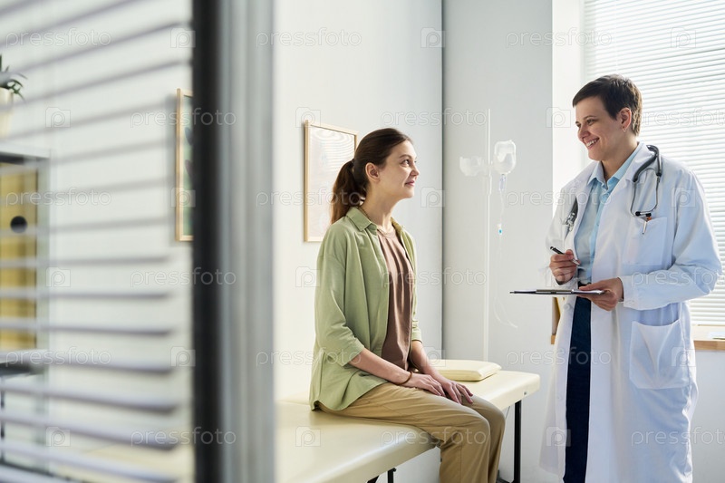 Улыбающийся врач разговаривает с женщиной-пациентом в больничной комнате