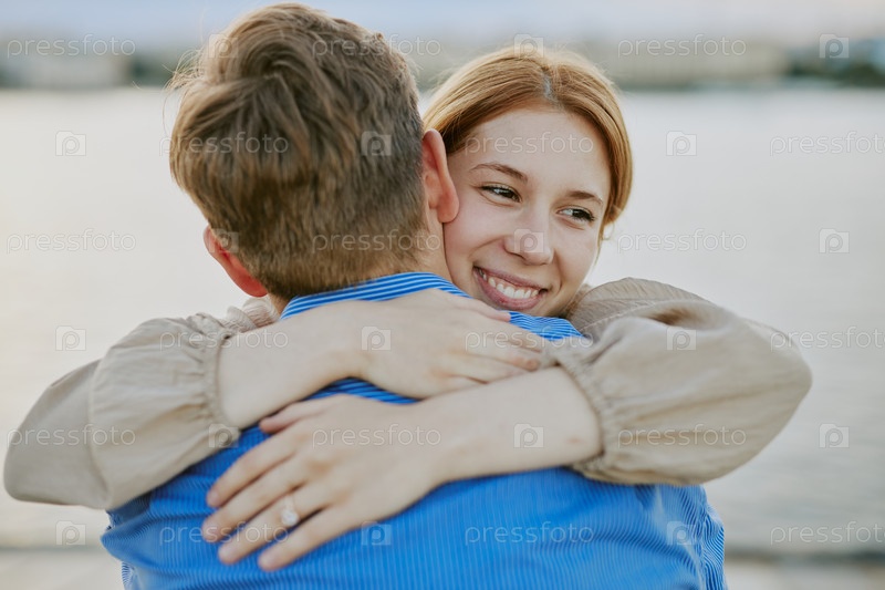 Улыбающаяся женщина обнимает мужчину на открытом воздухе возле воды