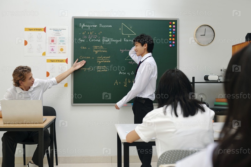 Объяснение теоремы Пифагора на черновой доске в классе