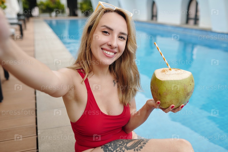 Улыбающаяся женщина делает селфи у бассейна, держа кокосовый напиток