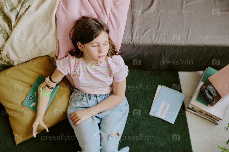 Усталая девочка-подросток сидит с закрытыми глазами