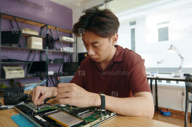 Мастер, работающий с сломанным ноутбуком в мастерской