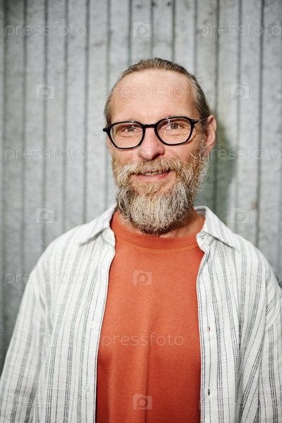 Улыбающийся бородатый мужчина в очках Снимок с флэш-метальным стеновым фоном