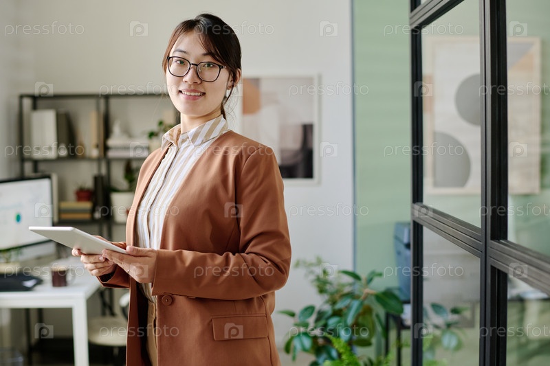 Портрет улыбающегося молодого профессионала, держащего планшет