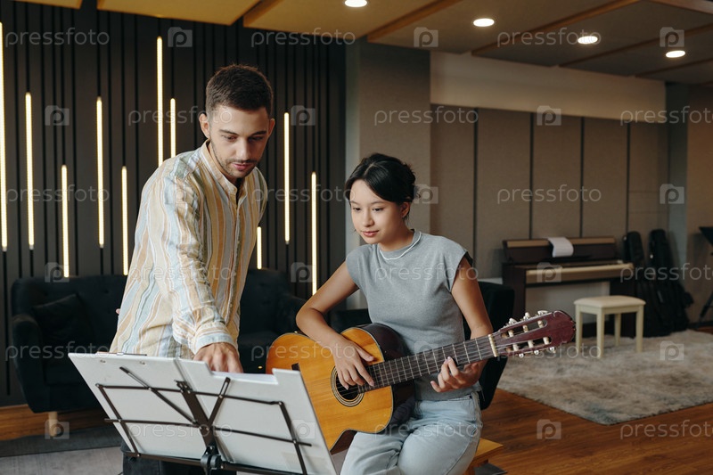 Руководство молодого музыканта во время практики гитары