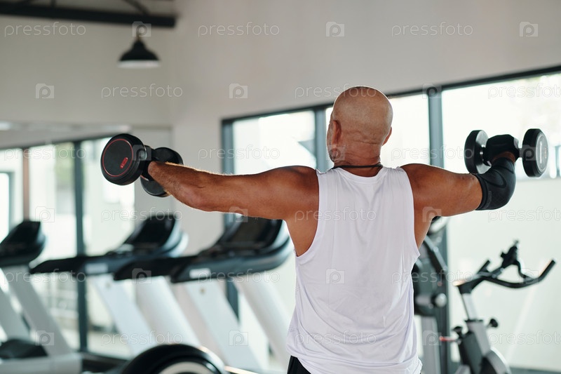 Спортсмен, тренирующийся с гантеликами в спортзале