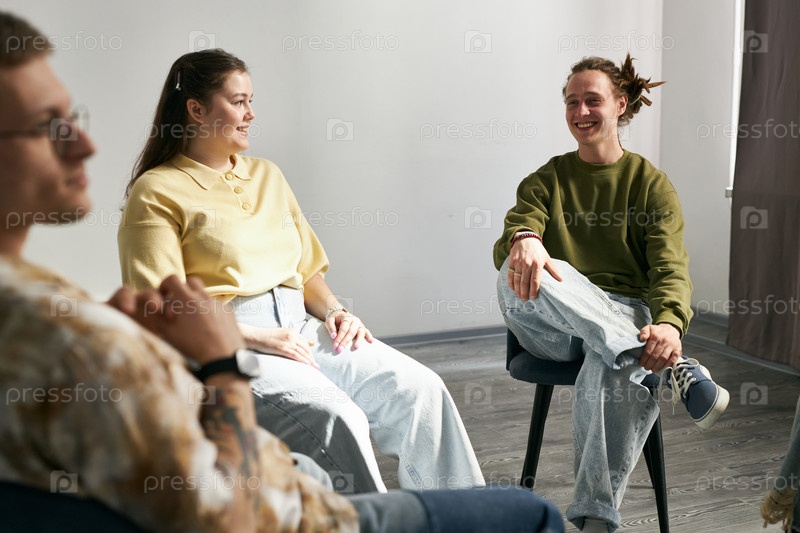Улыбающиеся люди, сидящие во время неформальной встречи