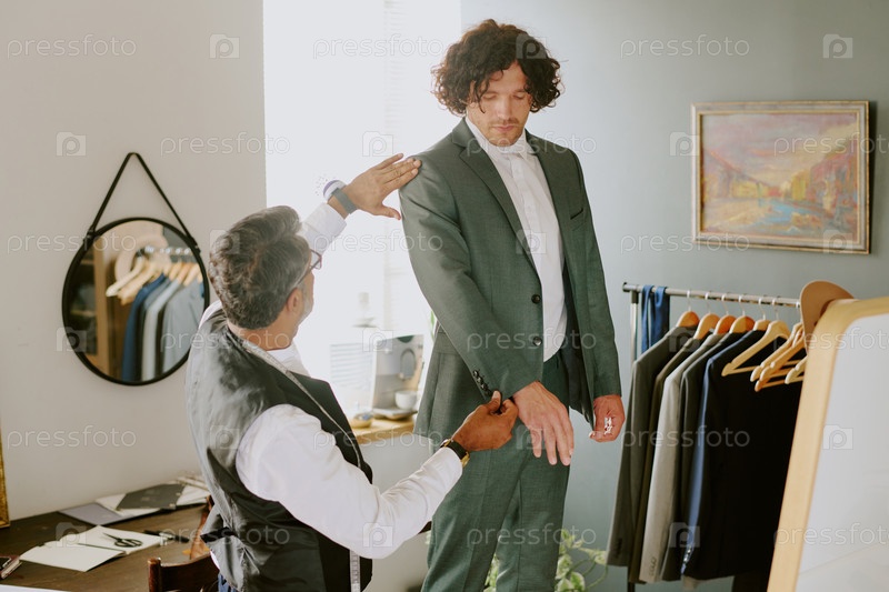 Талер и модель обсуждают костюмы с рукавами