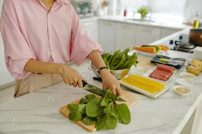 Женщина, режущая зелень для салата