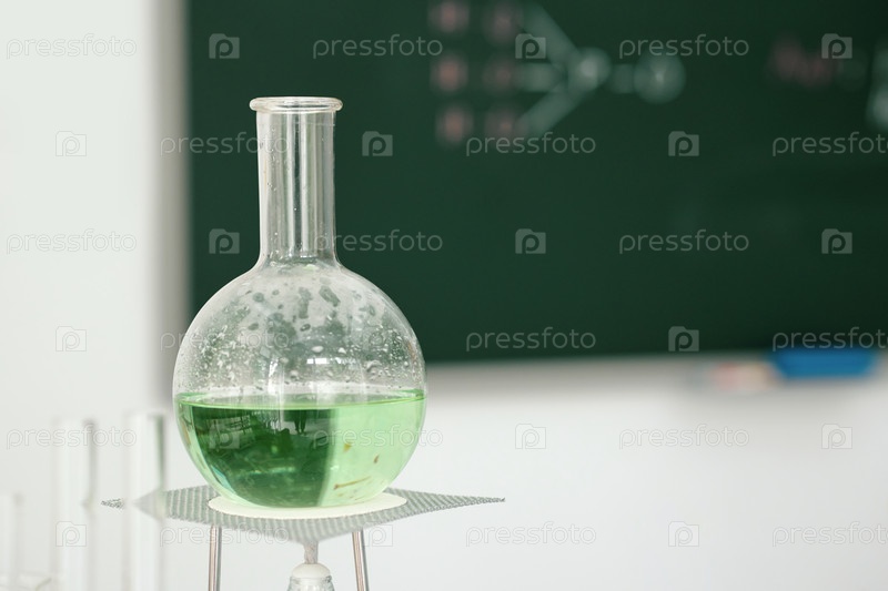 Наблюдение за зеленым раствором в стеклянной бутылке в лаборатории