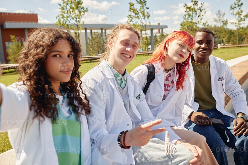 Сельфи четырех улыбающихся студентов из разных этнических групп на улице в кампусе